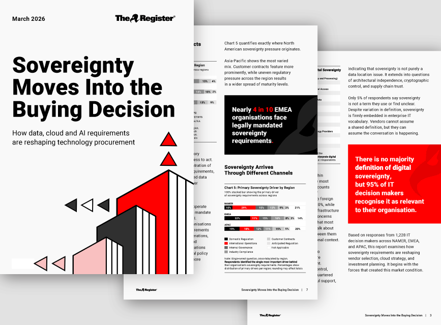 Reader studies. Complete the form to download Select your regionEMEAAPACLATAMNAMER Important: On iPhone/iPad: if your download doesn’t start, check Safari Settings → disable ‘Block Pop-ups’ temporarily or try Chrome March 2026Sovereignty MovesInto the Buying DecisionHow data, cloud and AI requirementsare reshaping technology procurement London27 Old Gloucester St London WC1N 3AX UK Singapore36 Robinson Road #20-01 City House 068877 Singapore San Francisco17-111 Two Embarcadero Center San Francisco California USA Boston33 Arch Street Boston MA 02110 USA Our BrandsThe Register | DevClass | Blocks & Files | The Next Platform London27 OldGloucester StLondonWC1N 3AXUK Singapore36 Robinson Road#20-01 City House068877Singapore San Francisco17-111 TwoEmbarcadero CenterSan FranciscoCaliforniaUSA Boston33 Arch StreetBostonMA 02110USAThe Register Our BrandsThe RegisterDevClassBlocks & FilesThe Next Platform